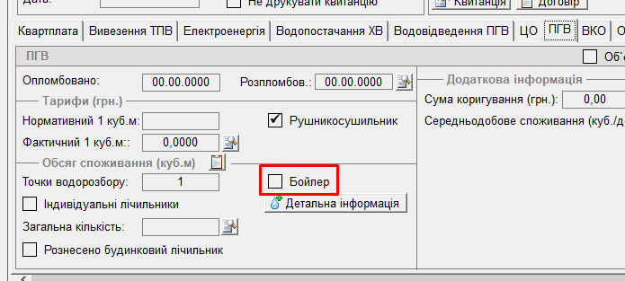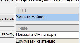 Змінити Бойлер — можливість зняти або проставити бойлер (щоб змінити дію — потрібно натиснути повторно на вкладку). Якщо обрали "поставити бойлер", у картці абонента з'явиться галочка біля графи "бойлер" і навпаки.