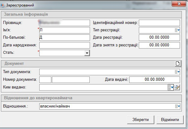 При виборі пункту "Змінити ПІБ", у вікно "Зареєстрований" автоматично підтягується інформація про зареєстрованого "власника/наймача", є можливість змінити загальну інформацію на зареєстровану людину (власника) по даному ОР: ПІБ, Інд. номер, дата народження, стать, тип реєстрації, дата реєстрації; документи: додати або змінити дані паспорта, свідоцтва про смерть або народження та ін.; відношення до квартиронаймача.