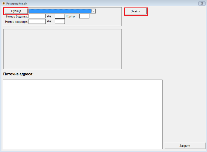 - далі знайти потрібну адресу, для цього нажати на кнопку "Вулиця", і відкриється вікно "Пошук":