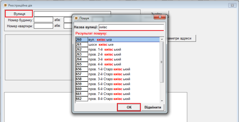- у полі "Назва вулиці" вказати потрібну назву, і з списку вулиць вибрати потрібну (клацнувши мишкою один раз по потрібній вулиці, вона виділиться синім кольором) і нажати на кнопку "ОК" - вулиця, яку вибрали зі списку буде відображена у полі "вулиця".