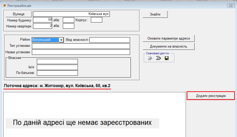 - для того, щоб по відкритій адресі зареєструвати мешканця, нажати кнопку "Додати реєстрацію":