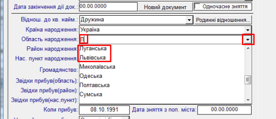 у полі "Область народження" можна вказати першу літеру назви області та натиснути стрілочку вниз, після чого у списку першими будуть відобнажені назви які починаються на вказану літеру: