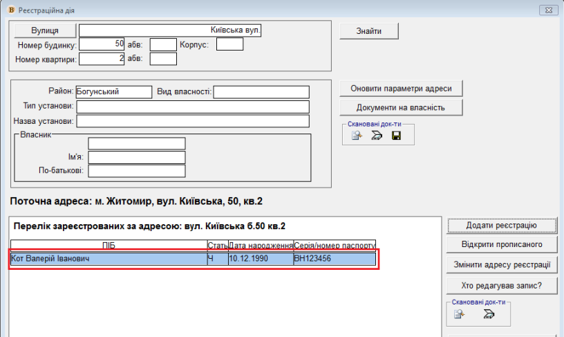 - дана людина буде відображена у списку зареєстрованих по даній адресі: