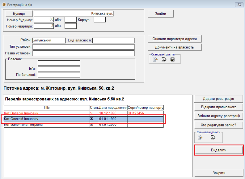 - виділити потрібну людину синім кольором (один раз клацнувши по дюдині кнопкою миші) і нажати кнопку "Видалити" - і вибрана людина буде видалена з списку зареєстрованих.