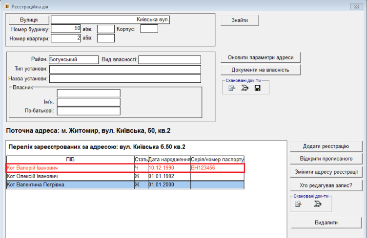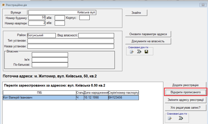 - по потрібному мешканцю двічі клацнути мишкою, або вибрати потрібного прописаного і нажати на кнопку "Відкрити прописаного", відкриється картка даної людини: