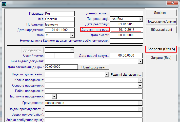 - у полі "Дата зняття з реєстрації" вказати потрібну дату зняття з реєстрації і нажати кнопку "Зберегти"