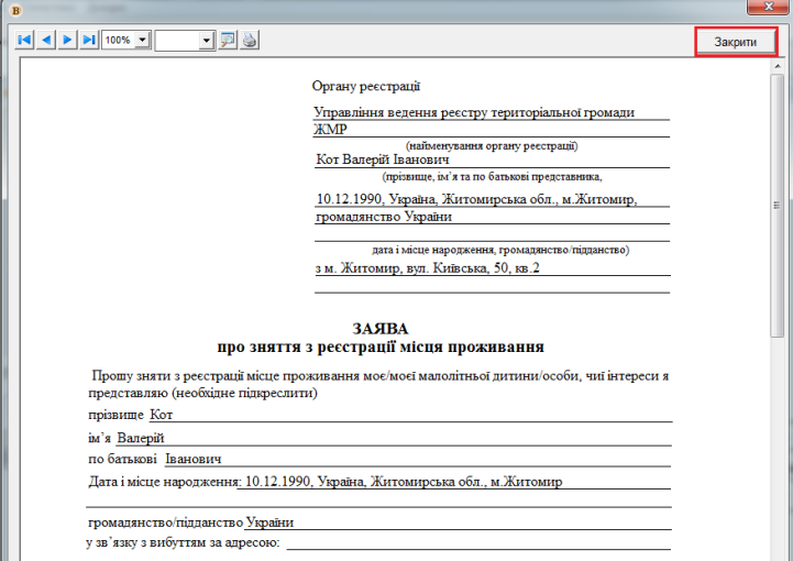 - після цього автоматично відкриється "Заява на зняття з реєстрацї", якщо потрібно можна заяву роздрукувати, або нажати "Закрити"