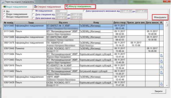 *Щоб знайти потрібне повідомлення, оберіть необхідні параметри для пошуку та нажміть кнопку "Фільтрувати"