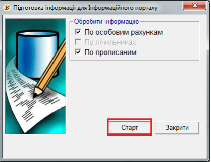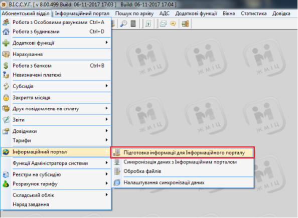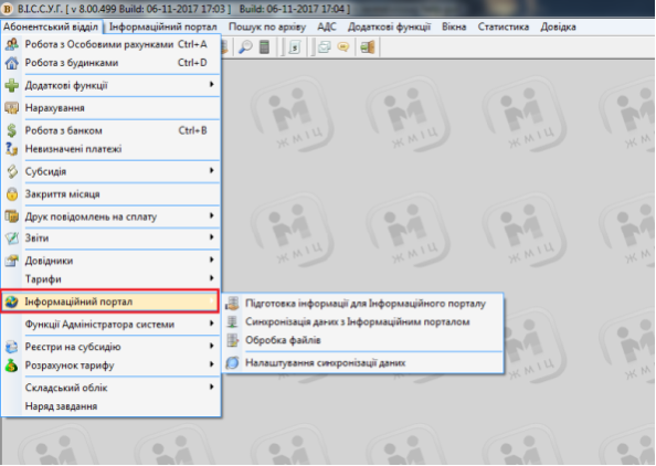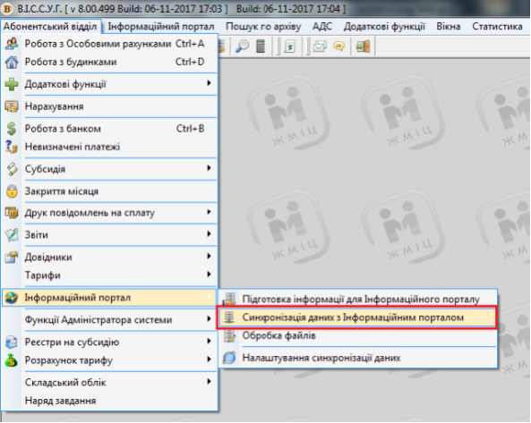 Для проведення обміну даними з інформаційним порталом, перейдіть у меню: "Абонентський відділ" - "Інформаційний портал" - "Підготовка інформації для інформаційного порталу", потім поставте галочки на потрібних пунктах та нажміть "Старт", після цього розпочнеться процес підготовки даних для синхронізації.