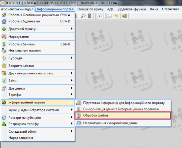 Щоб сформувати дані на основі даних з файлу, оберіть пункт меню: "Абонентський відділ" - "Інформаційний портал" - "Обробка файлів"