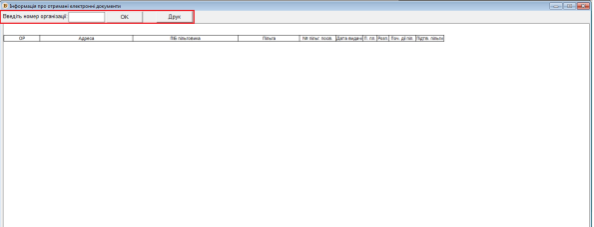 У вікні "Інформація про отримані електронні документи" потрібно вказати номер організації та нажати "ОК", також є можливість роздрукувати інформацію, натиснувши кнопку "Друк":