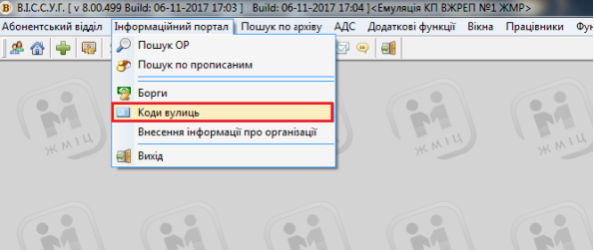 Для того, щоб дізнатись код вулиці потрібно увійти: "Інформаційний портал" - Коди вулиць", відкриється вікно "Коди вулиць"