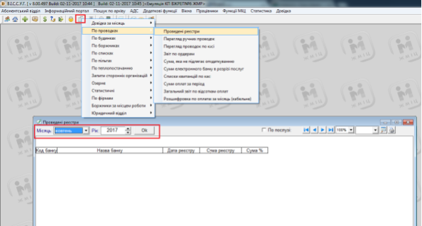 Для перевірки проведених реєстрів потрібно перейти "Абонентський відділ" - "Звіти" - "По проводкам", та обрати пункт "Проведені реєстри" після чого обрати потрібний період і нажати “OK”