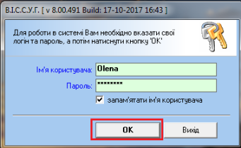 При запуску програми потрібно вказати Ім'я користувача та Пароль, і нажати ОК: