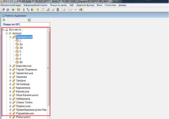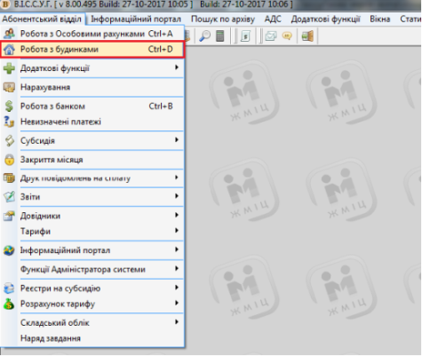 Для початку роботи з будинком виберіть пункт меню Абонентський відділ - "Робота з будинками" або натисніть клавіші CTRL+D