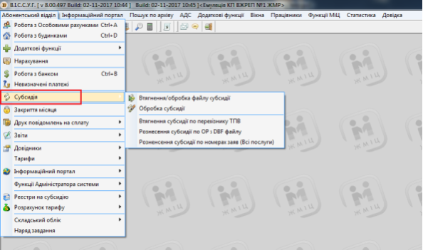 Для початку роботи з Субсидіями виберіть пункт меню "Абонентський відділ" - "Субсидія"