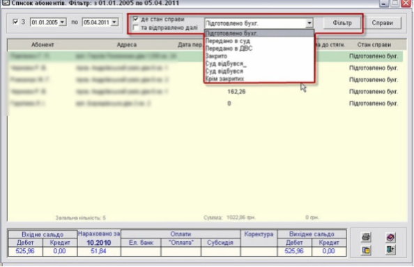 Для того щоб відфільтрувати список за станом справи увімкніть відповідний фільтр, виберіть потрібний фільтр та натисніть кнопку "Фільтр"