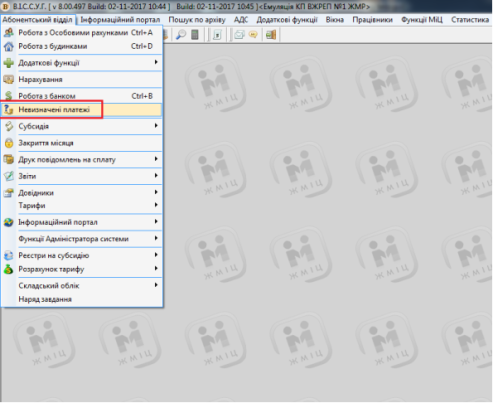 Для пошуку не визначених платежів потрібно увійти в пункт меню "Абонентський відділ" - "Невизначені платежі"