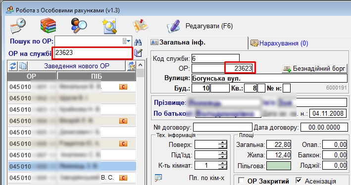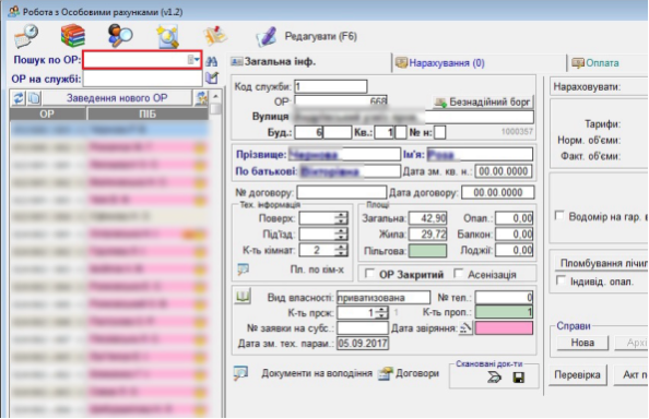 Для пошуку потрібного ОР: введіть номер особового рахунку в полі "Пошук по ОР" (поле відмічене на рисунку) і нажміть клавішу "ENTER"