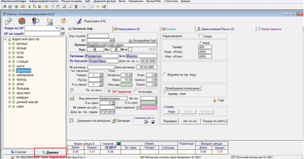 За допомогою навігаційного Дерева можливо легко і просто знаходити потрібний особовий рахунок. Щоб увімкнути потрібно нажати на вкладку "Дерево":