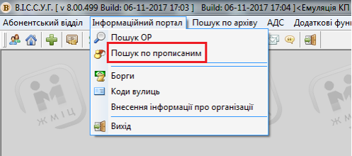 Для того, щоб знайти де прописана людина і хто є відповідальним квартиронаймачем у цій квартирі, потрібно у меню увійти: "Інформаційний портал" - "Пошук по прописаним"