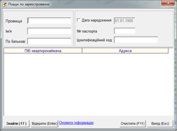 Відкриється вікно "Пошук по зареєстрованих", в даному вікні потрібно вказати дані для пошуку і нажати "Знайти"(F7)