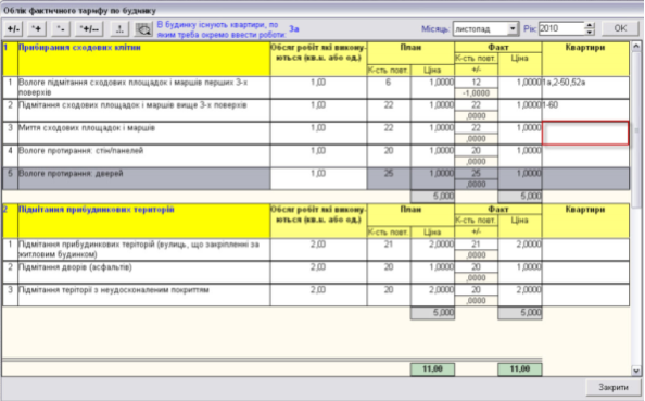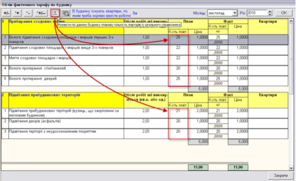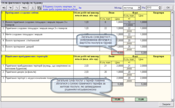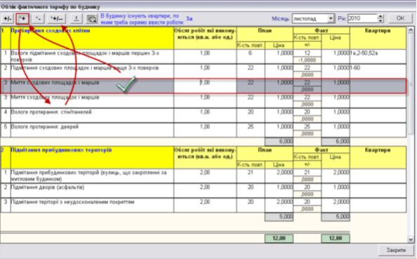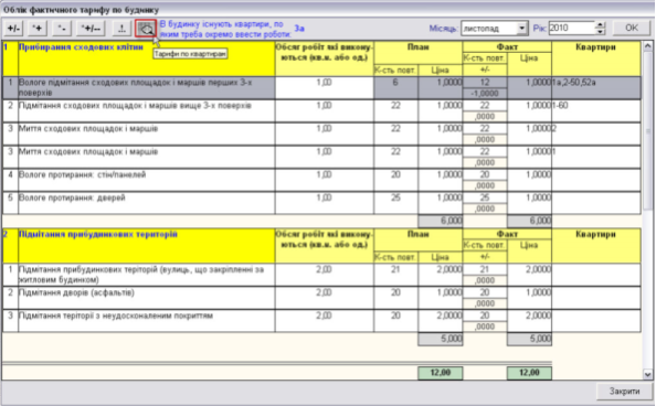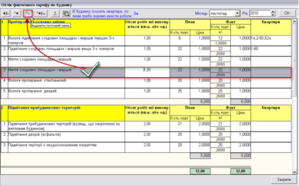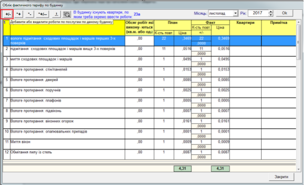 У вікні "Облік фактичного тарифу по будинку" можна додати або видалити роботи по послугам в даному будинку, для цього нажати відповідну кнопку:
