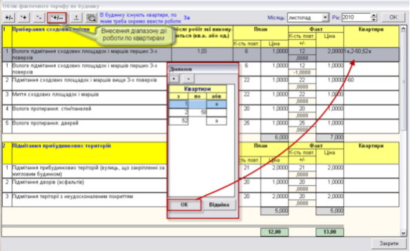 Введення діапазону дії роботи по квартирам, діапазон можна задавати як для окремої квартири (1, 2а,), так і для проміжку квартир (1-30, причому квартири такі як 2а, 10б туди не потраплять):