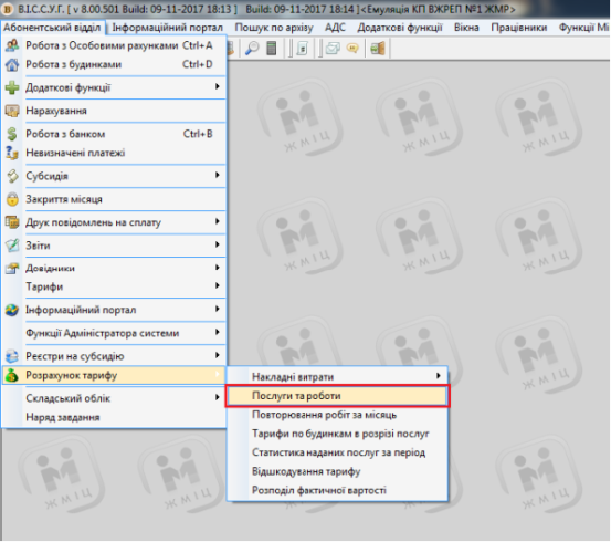 Для початку роботи необхідно зайти в меню "Абонентський відділ" - "Розрахунок тарифу" - "Послуги та роботи"