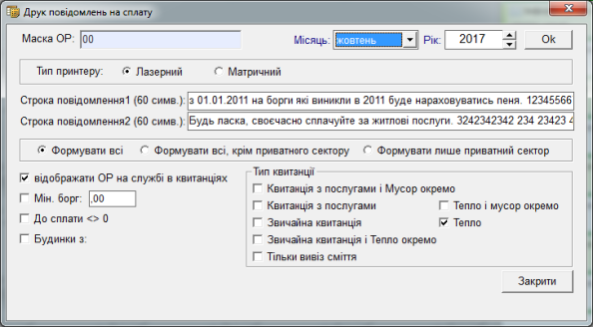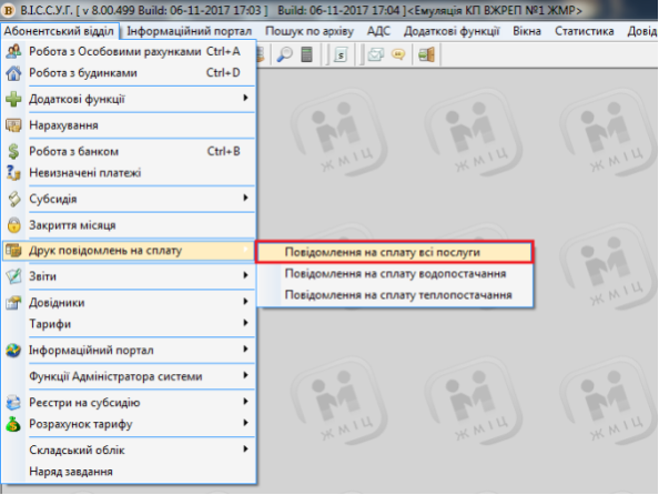 Для друку "Повідомлення на сплату всі послуги" перейти в меню: "Абонентський відділ" - "Друк повідомлень на сплату" - "Повідомлення на сплату всі послуги"