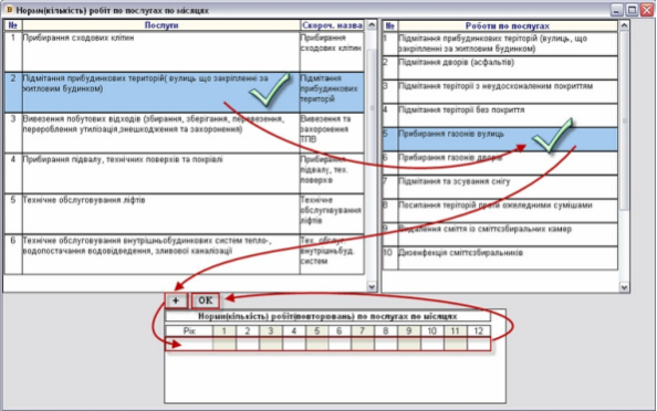 У вікні "Норми(кількість) робіт по послугах по місяцях" потрібно ввести повторювання робіт по кожній з послуг. Для цього: обрати послугу, далі вибрати роботу по цій послузі, нажати на "+" і завести рік та кількість повторювань по кожному місяцю. Після заведення даних нажати на кнопку "ОК".