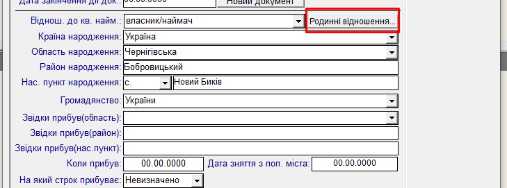 - Відкрити картку зареєстрованого, відкриється вікно, у якому натиснути кнопку “Родинні відношення”: