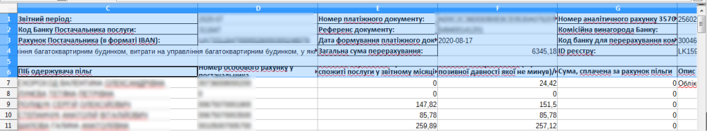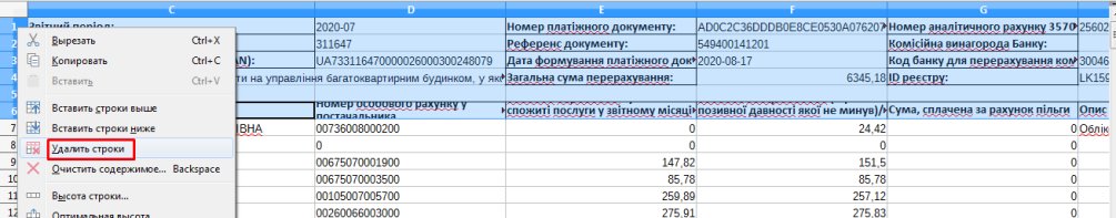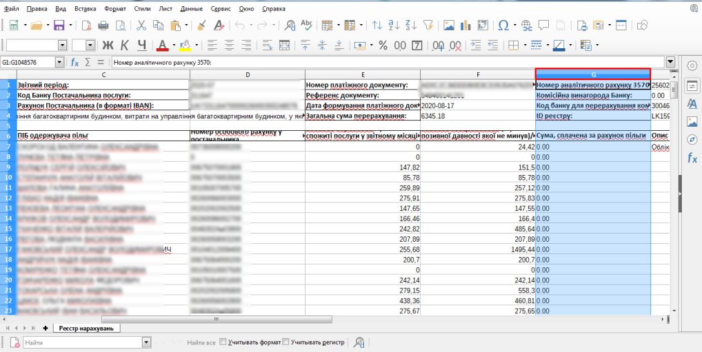 а якщо у колонці G, суми через крапку, тоді потрібно виділити колонку “G” (Сума сплачена за рахунок пільги/субсидії), клацнувши один раз по назві цієї колонки лівою кнопкою миші: