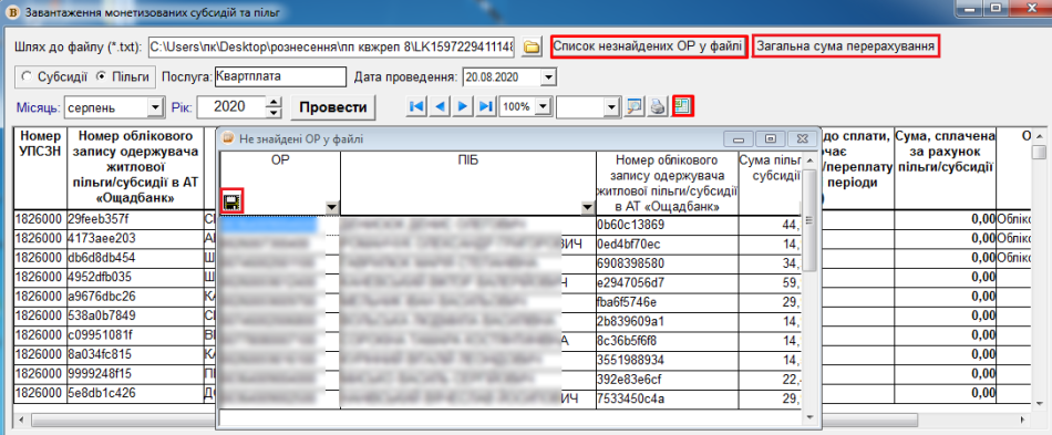 - натиснути на «Список незнайдених ОР у файлі», після чого відкриється список не знайдених особових рахунків