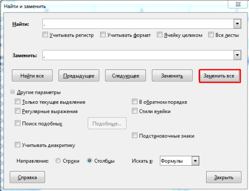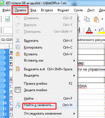 2. Далі у цій колонці потрібно замінити “крапки” на “коми”, для цього у меню вибираємо “Правка”, далі вибираємо пункт меню “Найти и заменить”: