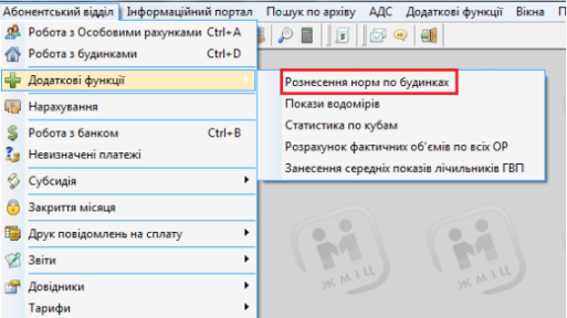 Для рознесення норм по будинках, потрібно вибрати відповідний пункт меню (Абонентський відділ - Додаткові функції - Рознесення норм по будинках):