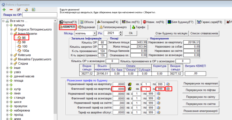 Робота з будинками - вибрати потрібний будинок - перейти на вкладку "КВЖРЕП" - далі по потрібній послузі проставити тариф, вибрати квартири "з... по.." та натиснути кнопку для рознесення тарифу: