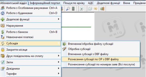 Для того, щоб рознести субсидію по ОР з DBF файлу, зайти: "Абонентський відділ" — "Субсидія" - "Рознесення субсидії по ОР з DBF файлу".