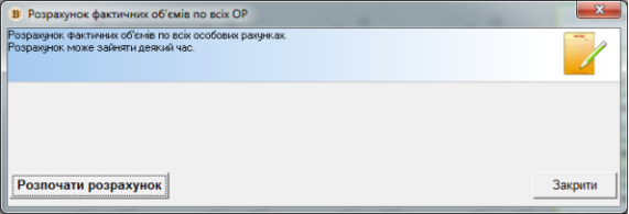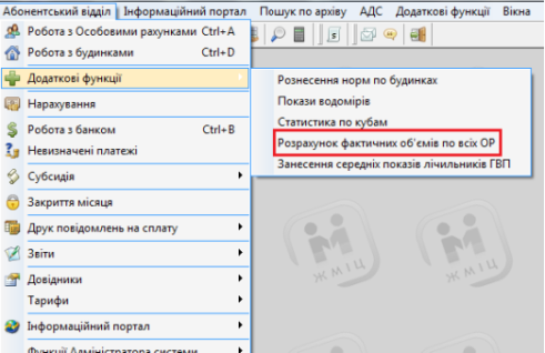 Для розрахунку фактичних об'ємів по всіх ОР потрібно вибрати відповідний пункт меню (Абонентський відділ - Додаткові функції - Розрахунок фактичних об'ємів по всіх ОР):