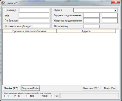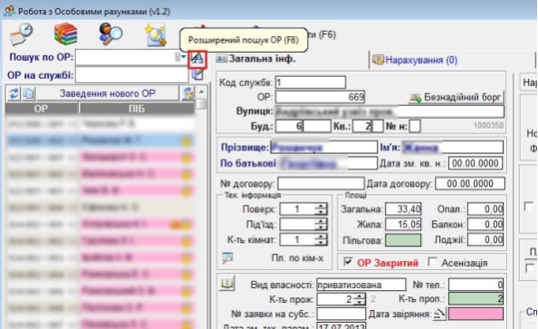 "Розширенний пошук (F8)" - проведення пошуку ОР, з використанням додаткових параметрів (прізвище, ім'я, по-батькові, адреса та ін.)