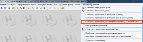 Для того, щоб подивитись статистику прописаних, які народились за період та в сім'ї є пільга, у меню "Статистика" потрібно вибрати відповідний пункт: