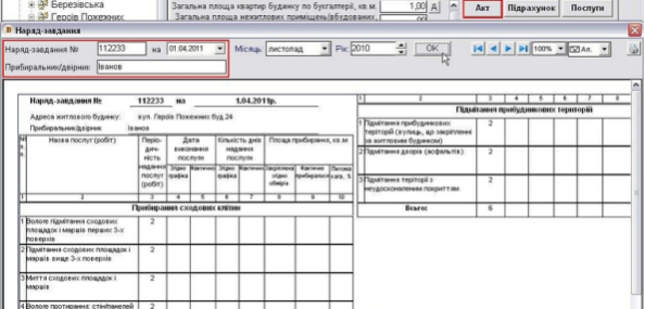 * Щоб створити акт на виконнання робіт, нажміть кнопку "АКТ". Відкриється вікно для створення наряд-завдання, де ви можете вказати його номер, станом на яку дату і прибиральника (двірника).
