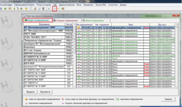 * В лівій колонці "Відправник" відображено список організацій які відправили вам повідомлення, в правій частині вікна відображено список повідомлень від вибраної вами організації.