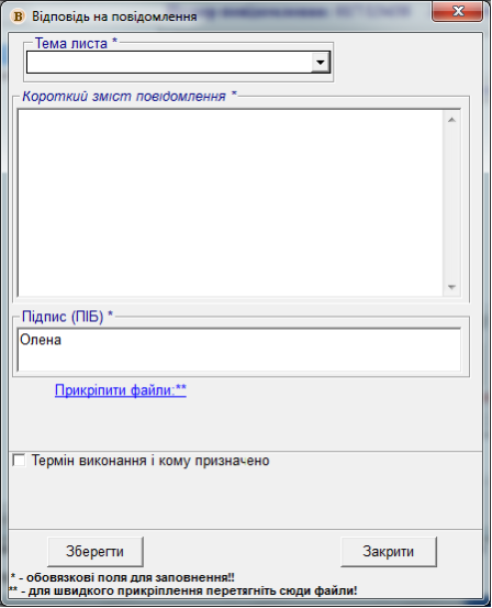 Для того, щоб написати відповідь на повідомлення, потрібно нажати на кнопку "Відповідь" і відкриється вікно "Відповідь на повідомлення".
