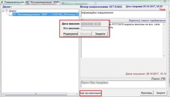Для того, щоб відмітити повідомлення, як виконане: відкрити потрібне повідомлення, нажати кнопку "Інф. про виконання" - Редагувати - Зберегти - Закрити.