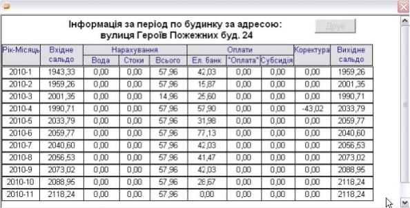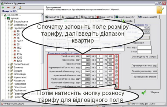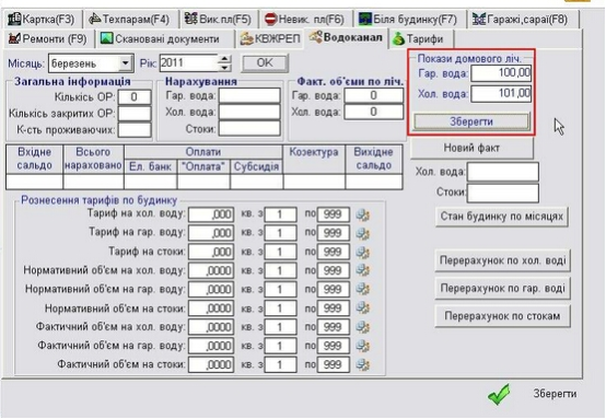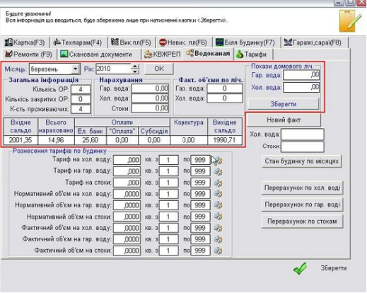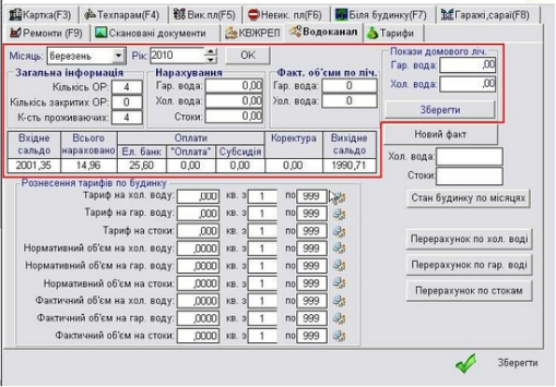 На вкладці "Водоканал" відображено інформацію по будинку для водоканалу: