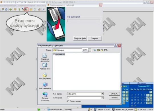 Для втягнення субсидій: виберіть пункт меню "Абонентський відділ" - "Субсидія" - "Втягнення обробка файлу субсидій (або нажміть на кнопку на панелі інструментів) та оберіть шлях до файлу.