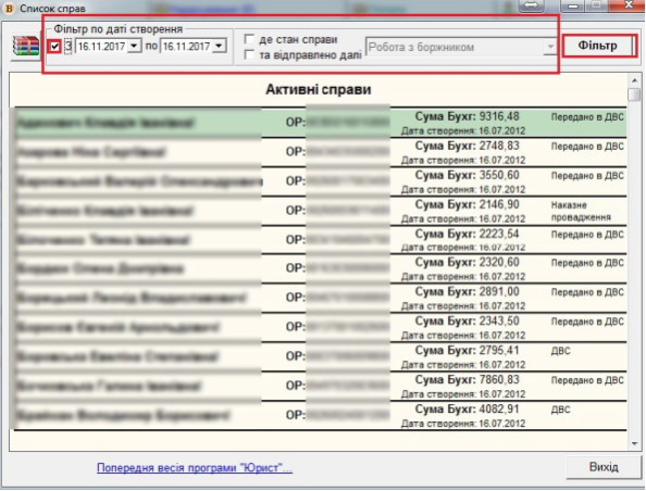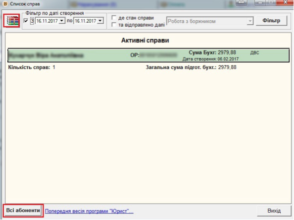 Якщо потрібно перейти в попередній вигляд вікна "Справи", нажміть на кнопку "Попередня версія програми "Юрист""