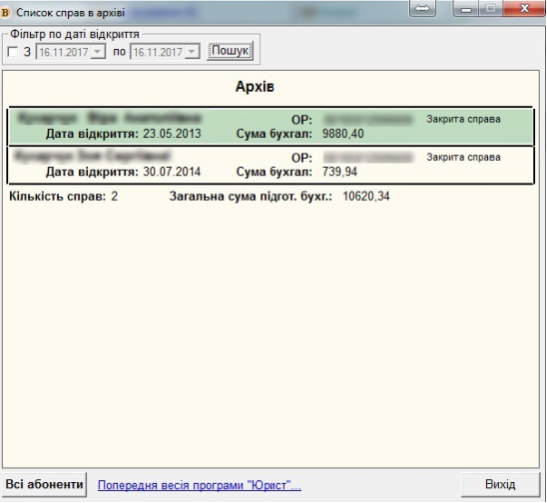 щоб переглянути архів справ по абоненту, нажати на кнопку "Архів"(кнопка "кольорові книжки"), відкриється вікно "Список справ в архіві":